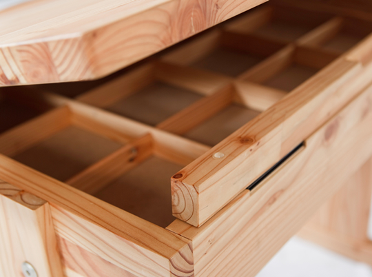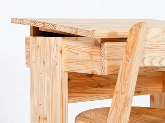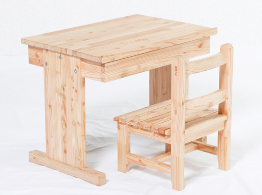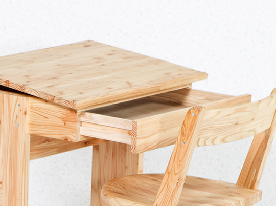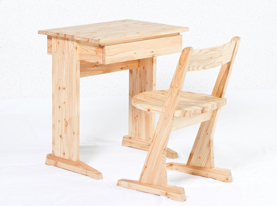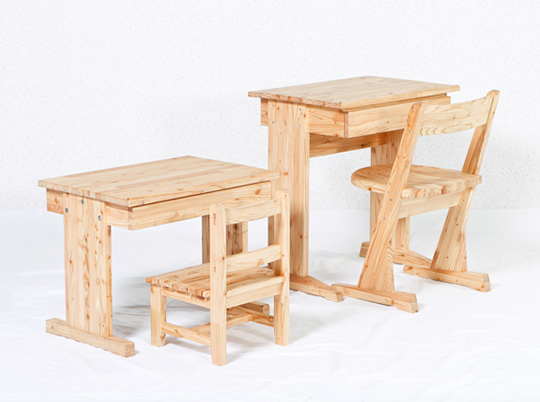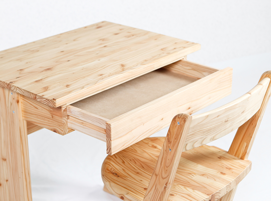 ボクの机幼児用の机です。椅子はお子さん用の椅子と座面が少し大きな椅子のセットお母さんやお兄ちゃんと一緒に座ってお絵描きや絵本を読んだりできます。小さなお子さんが天板いっぱい使えるよう角度調整ができます。引出は宝物を分けてしまえるよう仕切りがついています。学童用机組立式になっているので入学時に生徒が自ら組立して卒業まで使用する。机は学校生活の思い出を刻み生徒と共に卒業する。